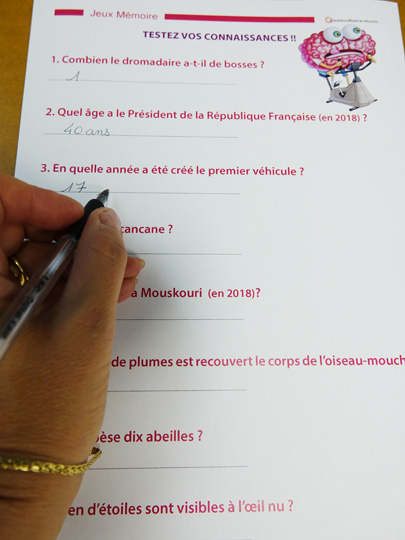 Christelle propose un quiz avec 40 questions sur des sujets aussi divers que les animaux, la géographie, les artistes populaires ou insolites comme le poids d’un hippopotame ou le nombre de pattes du crabe. Ce jeu est disponible en version papier à utiliser à l’oral ou à l’écrit en fonction du public.