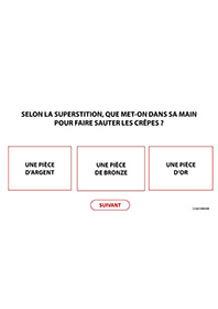 Ce quiz à projeter est composé de 36 diapositives. Il permettra de réviser ses connaissances sur une fête calendaire. Pour chaque question posée, des propositions sont données, les personnes devront trouver la bonne réponse. Créé sous forme de QCM, la réponse à chaque question s'affiche en vert en un clic (il faut cliquer sur les réponses proposées pour découvrir la bonne réponse qui s'affiche en vert).