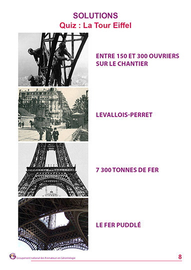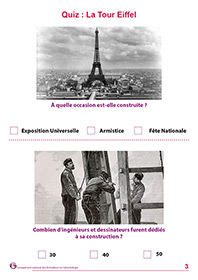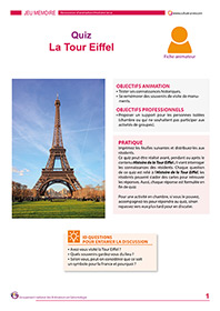 Ce quiz à imprimer vient interroger les connaissances des résidents sur le symbole de la France, la Tour Eiffel. 10 questions sont reliées à ce monument. Ce contenu peut être réalisé avant, pendant ou après le contenu Histoire de la Tour Eiffel en ligne sur Culture à Vie.