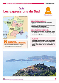 Dans cette ville, je connais dégun ! Ce quiz aborde les termes du Sud de la France. 16 expressions à découvrir à l’aide de trois réponses possibles à chaque fois … Les solutions sont données en fin de quiz. Ce contenu est adapté à une animation individuelle pour les personnes âgées.
