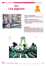 Ce quiz à imprimer et à utiliser en animation collective et/ou individuelle, permettra aux amateurs d’ornithologie de vérifier leurs connaissances en matière de pigeons. 14 questions abordent ces oiseaux connus par tous les résidents. Ce quiz se présente sous la forme d’un vrai ou faux (ou les deux), les réponses sont données en fin de quiz.