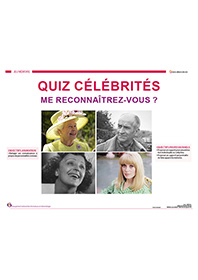 Maxime propose un diaporama quiz pour deviner quelles sont ces personnalités dissimulées derrière les déformations photos. Des photos d’acteurs, de chanteurs et de personnalités, suivies des réponses. Ce contenu d’animation fait appel à la mémoire et à la perspicacité, il permettra également aux résidents d’évoquer leurs souvenirs liés aux déférentes personnalités.
