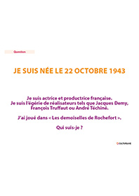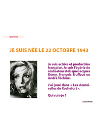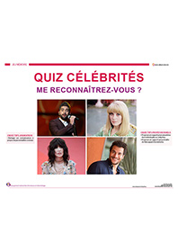 Sur le même principe que la première version de ce quiz personnalités, Julie propose un diaporama quiz pour deviner quelles sont ces personnalités connues. Une vingtaine de questions sur des acteurs, chanteurs et des personnalités sont suivies de leurs réponses. Ce quiz fait appel à la mémoire, il permettra aux résidents d’évoquer leurs souvenirs liés aux personnalités. Deux niveaux sont proposés. Le niveau 1 ajoute un indice photo pour plus de facilité.