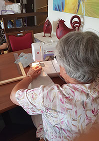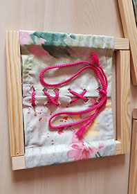 Anaïs partage un concept de cadres destinés à conserver un maximum d’autonomie dans les gestes du quotidien et notamment ceux liés à l’habillement. Fermetures Eclair, lacets et boutons cousus sur un cadre permettent de faire et défaire à son rythme. Des gestes simples qui visent à travailler la dextérité fine. Anaïs fournit les photos des cadres et le plan de ces derniers.