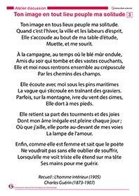 Ce concept d’atelier-discussion à destination des personnes âgées peut être utilisé en groupe ou en animation individuelle. Le sujet est ici la solitude. A partir d’un poème et d’un tableau, l’animateur a dans la fiche animateur des exemples de questions qui lui permettront d’aborder ce sujet délicat d’une manière plutôt positive comme dans le poème proposé. En fonction des commentaires des personnes vous pouvez terminer l’atelier par un atelier d’écriture sur ce thème.
