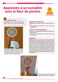Cette activité à destination des personnes âgées permet d’intégrer les nouveaux arrivants. Composé de 45 questions, certaines d’ordre générales, d’autres un peu plus intimes, permettront à l’animateur d’animer un atelier de partage de connaissances sur soi. L’animateur sélectionne ses questions et les pose tout en demandant qui souhaite répondre. La personne qui répond prend la fleur et personne ne peut alors lui couper la parole.