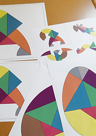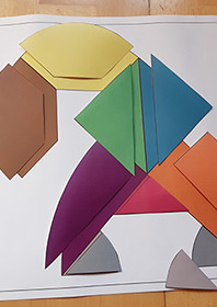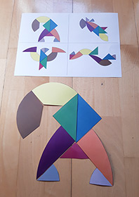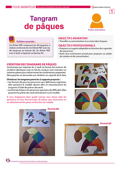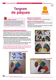 Ce support d’animation est créé sur le principe du tangram. Il s’agit, à partir de formes données, de reconstituer des animaux ou un assemblage de formes données ici en modèles. Les morceaux de couleurs étant assemblées au départ sous la forme d’un œuf, les fêtes de Pâques peuvent être un premier prétexte pour utiliser cette animation qui demande de la concentration. Deux niveaux ont été créés pour être accessible au plus grand nombre. Des modèles en format A6 qu’il faut reconstituer à côté et des modèles format A3 qui permettent de poser les formes de couleurs directement dessus.