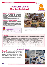 Cette animation s’appuie sur des images et un support à composer facilitant les échanges, les anecdotes et les souvenirs. Chaque personne dispose d’un support de fond vierge et des photos sont proposées au centre de la table. Chacun leur tour les résidents vont choisir une image en lien avec le thème proposé, ici le lieu de vie idéal (mer, campagne, montagne, montagne ou ville) et échanger sur leur choix. Chacun va ainsi construire son lieu de vie idéal et partager avec les autres ses rêves souvent en lien avec son vécu. Les résidents sont ensuite libres de repartir avec et de le partager avec son entourage ou de le laisser pour créer une exposition.