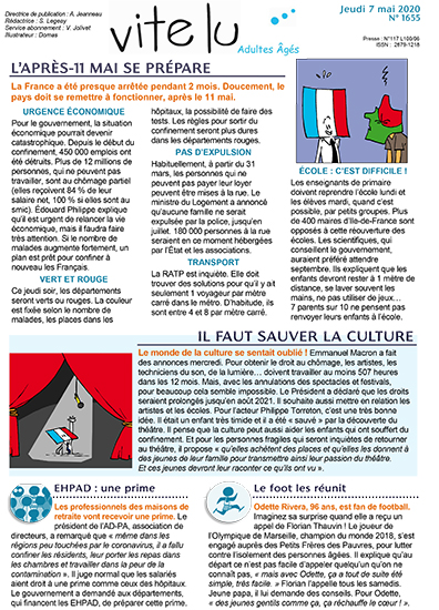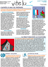 Nous vous invitons donc à être vous aussi solidaires et à vous abonner à ce service. Les abonnés reçoivent « Vite-Lu » sur leur boite mail tous les mardis soirs et jeudis soirs, et vous pourriez poursuivre vos animations de revue de presse, vos mises à disposition en chambre et dans les salons, pour des lectures individuelles ou en petits groupes. Merci de votre compréhension !