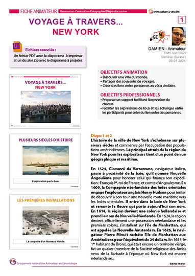 Damien, animateur suisse, partage un support d’animation pour faire voyager les résidents jusqu’à New York. Tout en approfondissant leurs connaissances, les résidents pourront sillonner à travers le temps, de la découverte de cette emblématique ville à aujourd’hui, sans oublier les lieux incontournables. Autant de discussions pour s’évader et partager ses souvenirs et ses voyages.